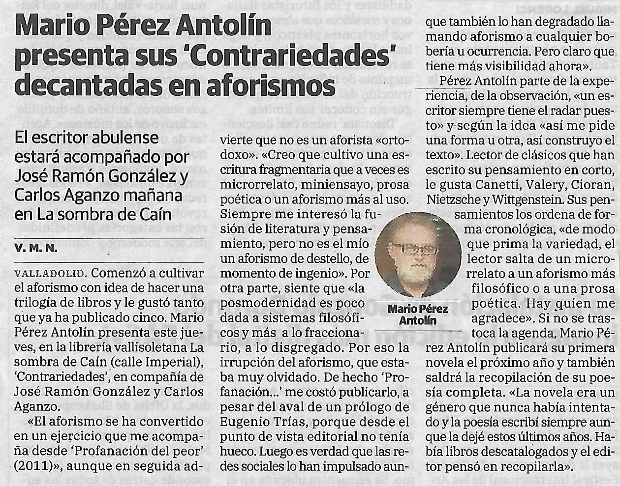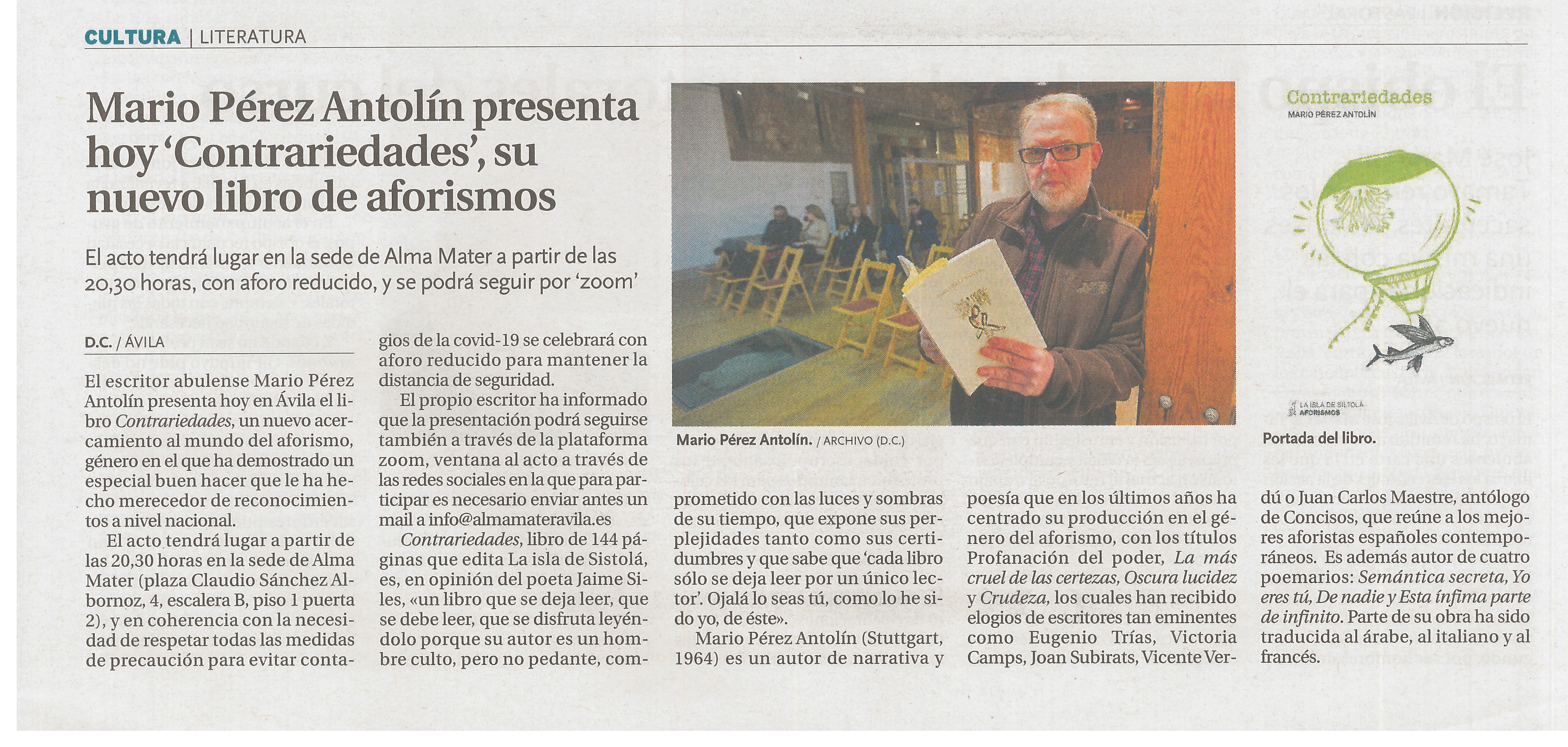 Artículo sobre "Contrariedades" en El Norte de Castilla. Publicado el 23-09-2020.