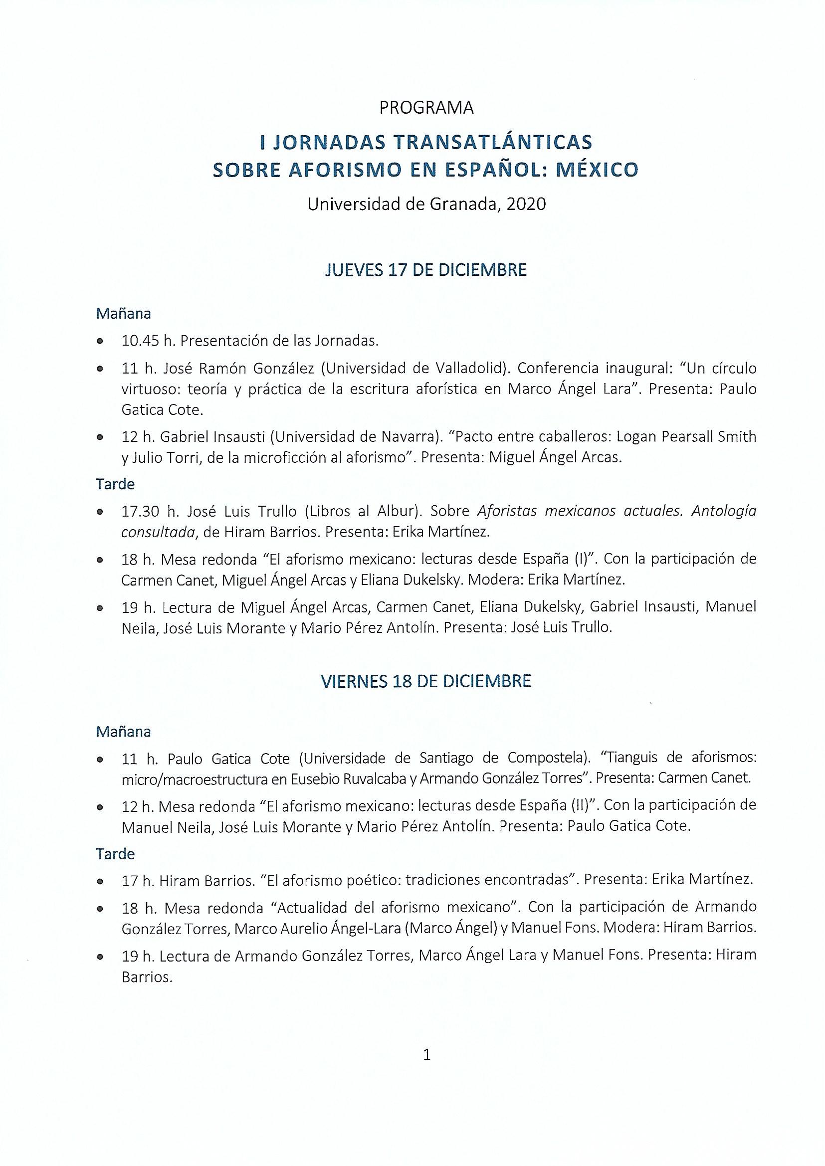 I JORNADAS TRANSATLÁNTICAS SOBRE AFORISMO EN ESPAÑOL: MÉXICO. UNIVERSIDAD DE GRANADA