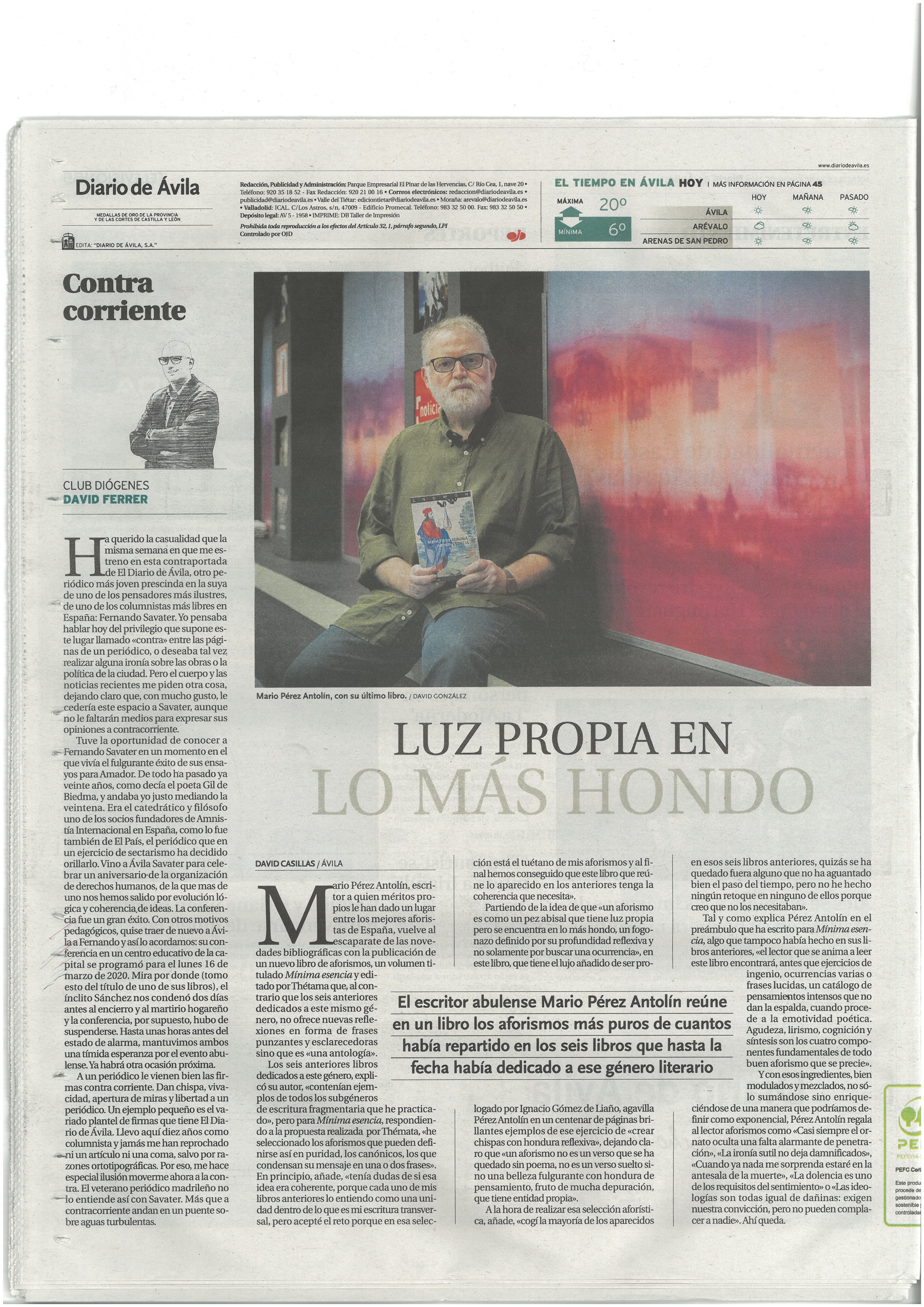 "Mínima esencia" en la contraportada del Diario de Ávila